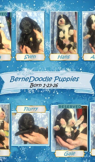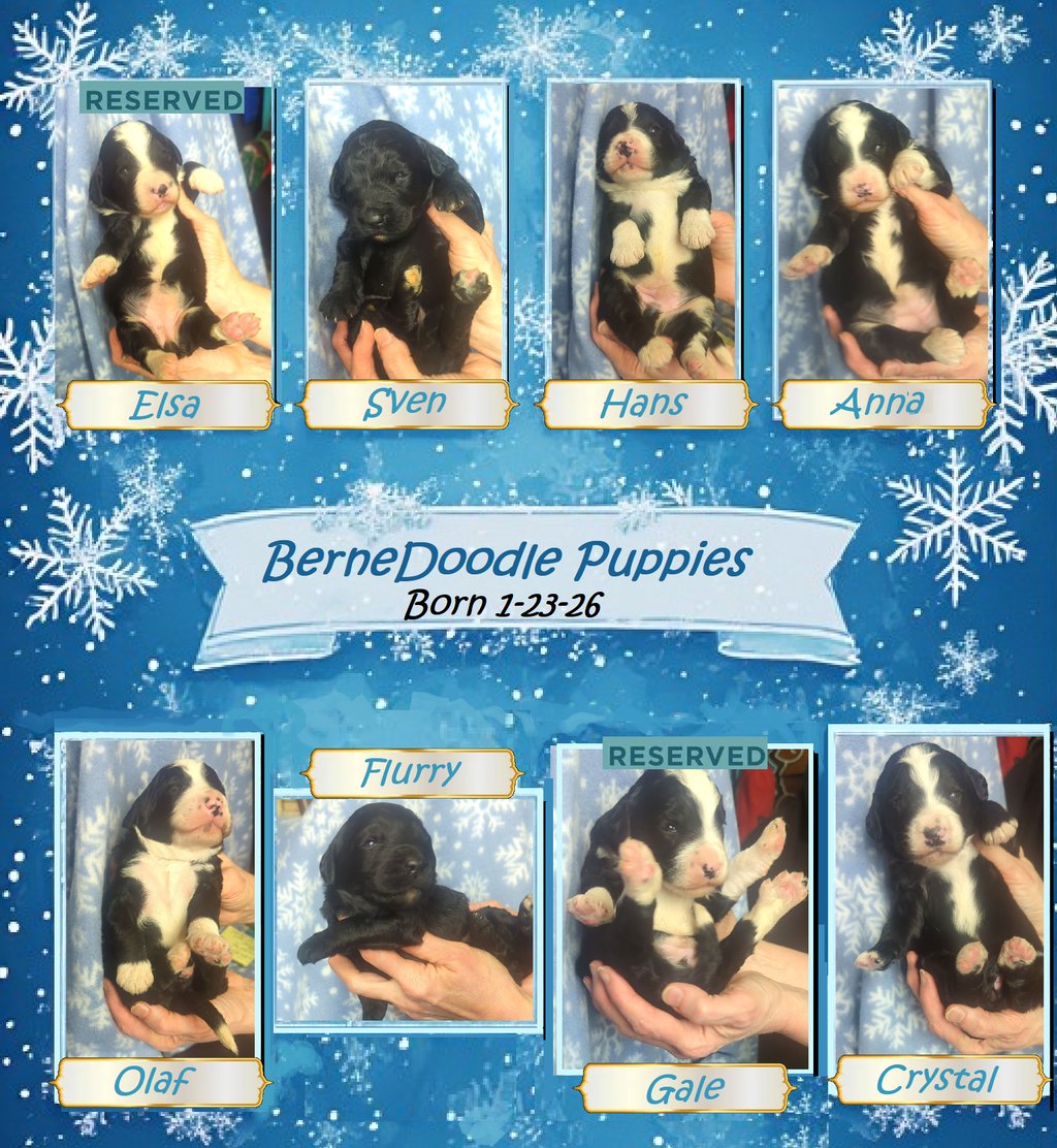 After you have reserved your puppy, we will keep in close contact, sending you pictures and videos every week so you can document your baby's growth! Our puppies are handled daily and well socialized! The pictures below were taken on 2/5/26 at age 2 weeks. The largest puppy in the litter is Crystal, with Sven and Hans following close behind. The smallest puppies in the litter are Flurry and Elsa.