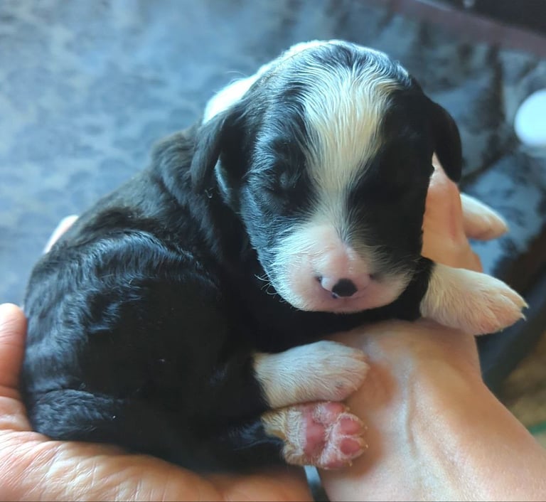 Sasha and MacIntosh welcomed a litter of puppies on Jan. 23rd, 8 in total - 3 boys and 5 girls. These are Standard F1 BerneDoodles (parents are purebred AKC registered Standard Poodle and AKC registered Bernese Mountain Dog). Adult weight estimated 65 to 85 lbs. (males tend to be larger). Contact us with questions or to reserve your puppy today! Puppies will be ready to go to their new homes at age 6-8 weeks (Anytime after March 6). Puppies will receive their first DA2PP vaccine at 6-8 wks before going to their new home (if desired, you can opt for your puppy not to receive this vaccine if you wish, just communicate your preference), as well as health checks and dewormings). BerneDoodles are fabulous family dogs and are known for being great with other dogs and children.