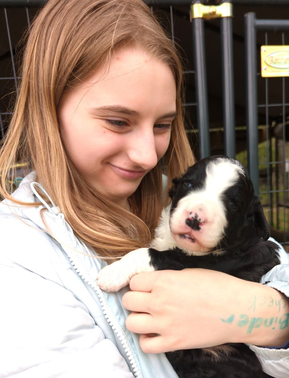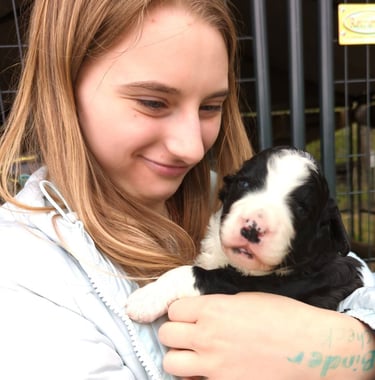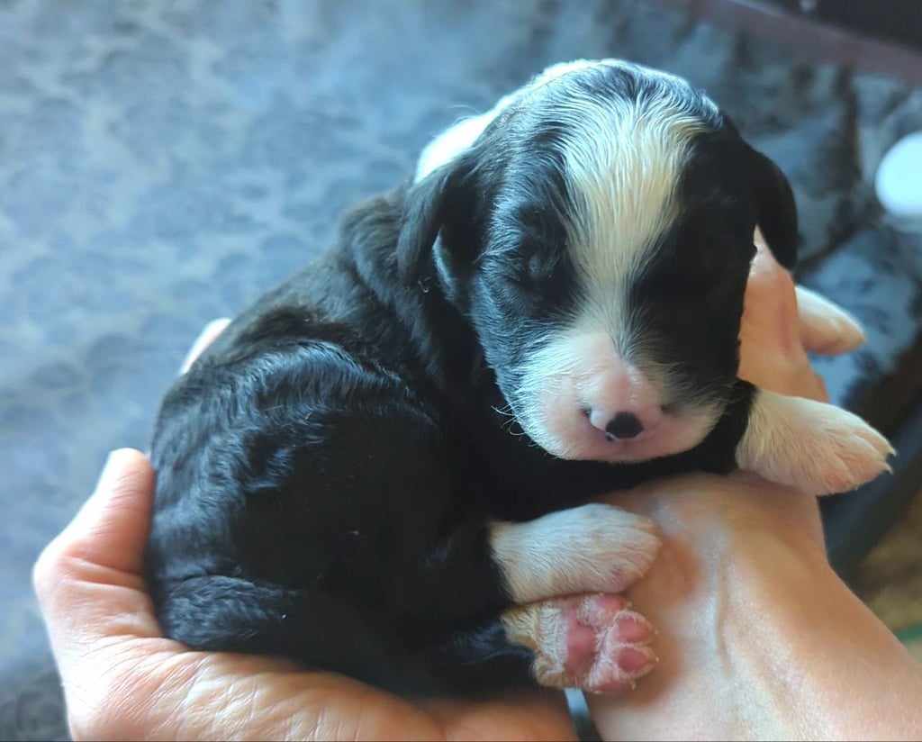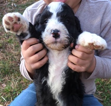 Sasha and MacIntosh welcomed a litter of puppies on Jan. 23rd, 8 in total - 3 boys and 5 girls. These are Standard F1 BerneDoodles (parents are AKC registered Standard Poodle and AKC registered Bernese Mountain Dog). Adult weight estimated 60 to 85 lbs. (males tend to be larger). Contact us with questions or to reserve your puppy today! Puppies are now ready to go to their new homes. Puppies will receive their first DA2PP vaccine at 6-8 wks before going to their new home (if desired, you can opt for your puppy not to receive this vaccine if you wish, just communicate your preference), as well as health checks and dewormings). BerneDoodles are fabulous family dogs and are known for being great with other dogs and children.