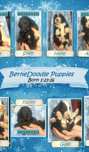 After you have reserved your puppy, we will arrange a meetup time, cost is $850 per puppy ca$h or cashiers check, discount for two puppies from the same litter. Our puppies are handled daily and well socialized! The pictures below were taken on 2/5/26 at age 2 weeks. The largest puppy in the litter is Crystal, with Sven and Hans following close behind. The smallest puppies in the litter are Flurry and Elsa.