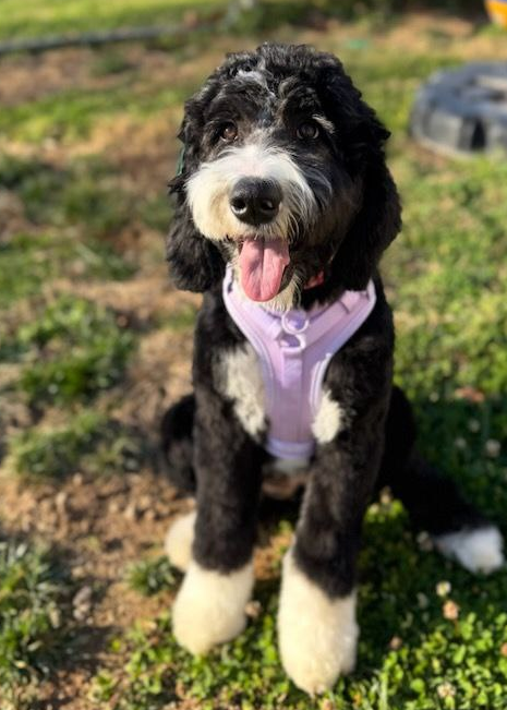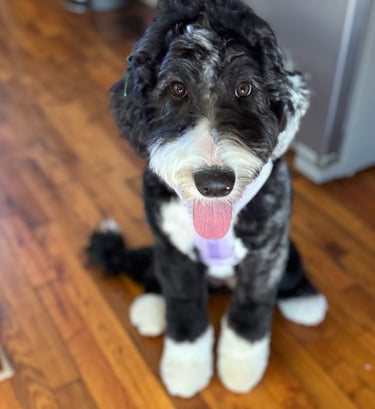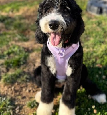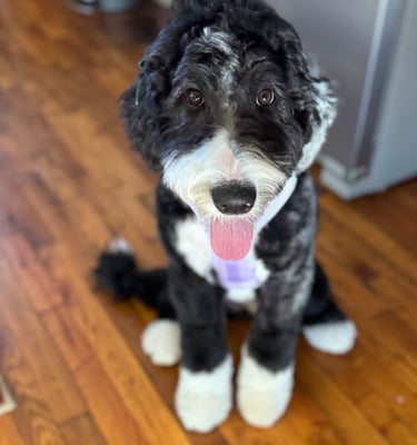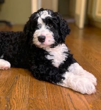 The Standard Bernedoodle is a cross between the Bernese Mountain Dog and the Standard Poodle. Their adult weight is 60-85 pounds, and their coats range from wavy to curly, and tends to be low-shedding. This hybrid combines the virtues of both parent breeds - the intelligence and sweetness of the poodle, with the loyalty and playfulness of the Bernese, making it the perfect family dog. Strong and robust with a compact and powerful body, they love to play and make great running companions. Because of their high energy nature they need some space to run and play, but they also enjoy couch lounging with their owners. Bernedoodles are responsive and loving. They make loyal family members, and tend to be good-natured with children and other pets, especially if acquired as puppies. Intelligent and social, they are fast becoming a favorite family dog. Goofy and playful, they are good at running, fetching, swimming, and are highly trainable. This breed is fairly hypoallergenic so there isn't usually much of a problem with shedding or dander, however they should be regularly groomed or brushed to help manage their curly locks. Bernedoodles tend to live longer than Bernese Mountain Dogs, thanks to the influence of the Poodle genes.